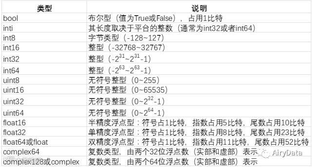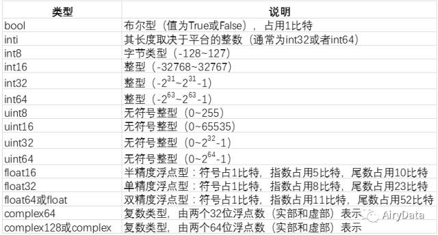 Python本身支持整型、浮点型和复数型,为了科学计算,numpy提供了更加丰富的数据类型,注意:numpy跟数学运算有关的数据类型的名称都以数字结尾。这个数字指示了该类型的变量所占用的二进制位数。Numpy的各种数值类型如下图所示: