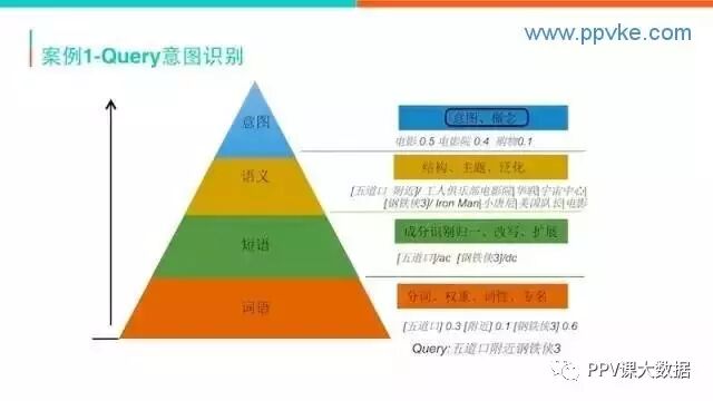 先说一下Query分析。最下层词语,比如说搜索五道口附近的钢铁侠3,最上面就会做一些成分识别。