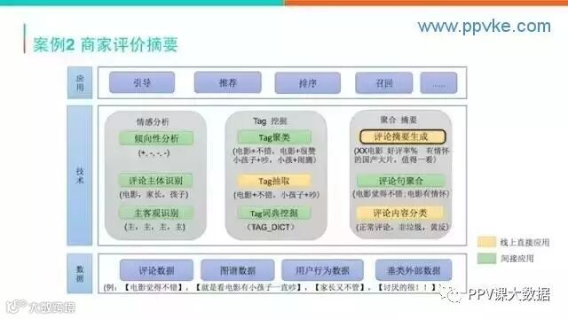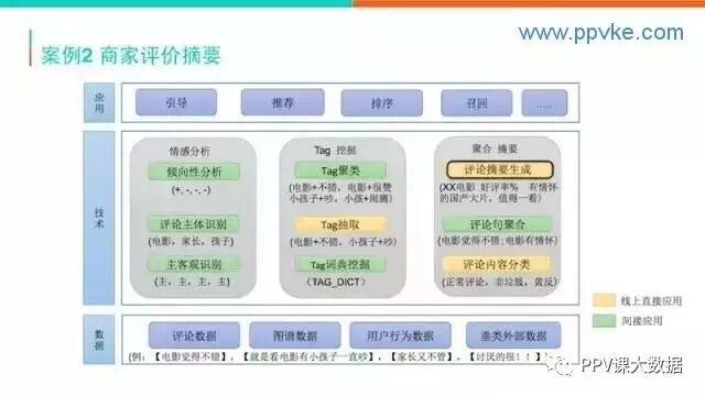 案例2,其实刚才说的美团点评有很重要的数据就是评论。评论可做的事情非常多,比如说下面是我们需要分析的一些评论的数据,我们要做的一些图谱或者第三方数据抓取的一些数据。我们会对评论展开一些分析,比如说觉得电影不错,这个首先我们会对它做一个句子的切分做成一个短句,做成一个与各方面的区别。这个时候有一些区别对待,再来区别评论的主题,这个更多的在细密度的操作和对Tag方面的一些理解,包括Tag的抽取,Tag的聚类一些东西。再往下就是整个评论,比如说刚才说的一些评论,评论区的一些聚合,重点就挑评论摘要的分成做一个介绍。