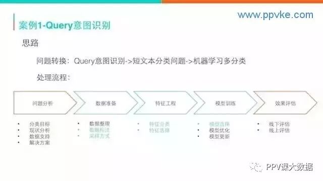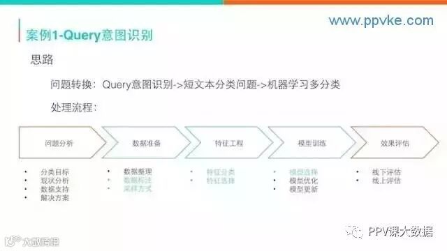 Query意图识别可以转换成机器学习多分类的问题。机器学习对一个问题有一套标准的流程,做过机器学习的都知道。首先要对问题做一个分析,要分哪一些类别,根据现状制定一个目标。现有数据的支持是否有一些标注的辞典、数据等等,根据这个再来整理数据,比如说如果标注数据不够怎么办,后面会做一些介绍。特征工程需要抽取很多特征,特别是你要考虑到O2O的一些特点,需要做一些事情。特征做完之后再做模型方面的一些选择和分析,最后做一些线下的评估,然后在线上镶嵌看它的效果。这个流程是非常通用的。