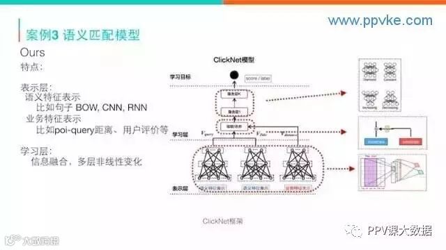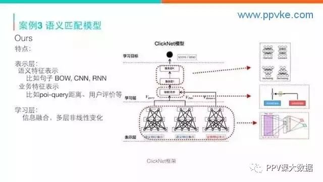 这里面重点的话,我们设计的特点应该是在表示层,从语意角度会有语意方面,比如说Query语意的一些表示,还有很多业务方面的特征,比如说O2O的一些特征,比如说把位置确定和商家之间的距离,如果把它做一种表示和语意结合起来的话,效果就非常好。