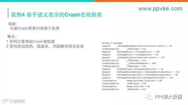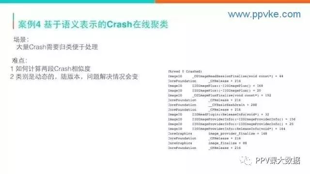 案例4,基于语意表示的Crash在线聚类。其实美团点评会出来一些Bug什么的,后台会搜集这样的信息。如果数据量非常大而处理人手不够,我们想做一些自动归类的处理,这个是处理过的一些信息。