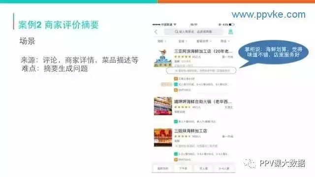 在我们展示的商家里面,除了Tag之外,可以把用户评论里面的一些表述提取出来,辅助用户做一些决策。当然,这里面的话,不仅仅可以从评论数据来做,还可以从商家详情里面做一些表述,当然它的难点的话,就是摘要生成会遇到一些问题,具体怎么做呢?简单说一下,就是大概分成几个流程:首先对评论做语句切片,在线上展示的时候会有一定限制的。接着做一些情感分析,比如说识别出它的一些正向的评论,因为一般情况下,不会把负向的放里面,选取有代表性的句子,这个事情已经在我们推进的产品上面。