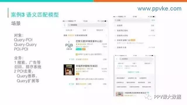 案例3,语义匹配模型。其实这个是用户非常多的,只要涉及到文本之间的匹配都会遇到这个问题。比如说Query和Query POI的相似度,比如说搜的是草莓蛋糕,需要和商家的标题做一些匹配;有一些输入的前缀做一些匹配,还会做一些Query的推进,比如说烤肉,这个是可以做到搜索广告等排序系统里面的。