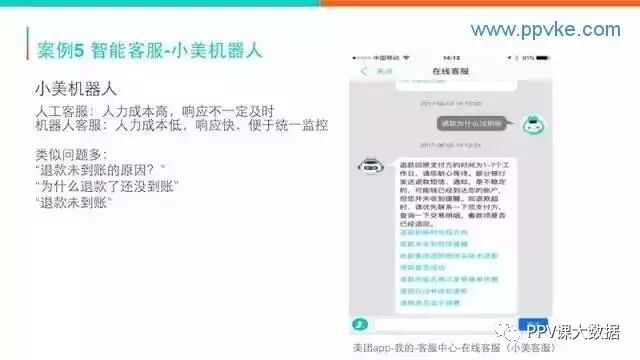 说一下小美机器人。小美机器人是人工客服,一台服务器能服务几个人,响应非常快,有一个好处就是可能问题的发现是很方便的。通过分析现有的问题,其实问题都很像。举个例子,比如说退款未到帐的原因,为什么退款了还没有到帐,其实这些表述就是为什么退款了还没有到帐,但是人口与的表述是千差万别的,基于这一点我们可以做一个模型来做客服的事情。这个可能目前藏的比较深了,APP客服里面藏的比较深。