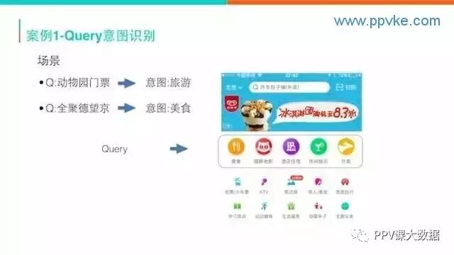 以Query意图识别做为例子。说一个Query,我们对它的类别做一个判别,比如动物园门票就是旅游,全聚德和望京是美食。我们可以分成不同的类别,这些类别有美食、电影、酒店之类的,还有很多二三级的品类。