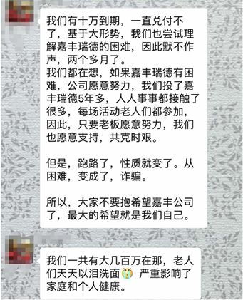 这次嘉丰瑞德董事长薛李鹏的跑路是无数个家庭的血汗钱、养老钱、奶粉钱打水漂了。某位在嘉丰瑞德投资超过600万元的上海投资者,直接说,要跳楼的心都有了。