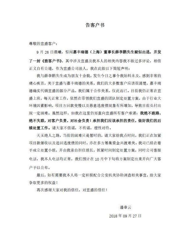 薛李鹏失联后,宝宜盛财富董事长潘章云先生也在第一时间发了一封内部信为自己澄清,其表示我们现在最主要的工作是安抚客户情绪,当问到是否有具体措施出台时,潘章云无法答复。有投资者表示此信无公司盖章,也未有在公司官网公告,可信度以及可接受度都不具有说服力。