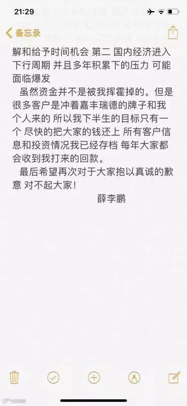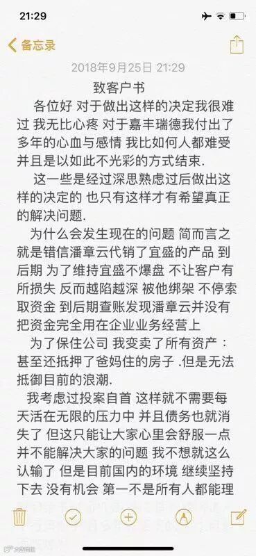 媒体也向嘉丰瑞德内部员工求证,薛李鹏跑路属实,《致客户书》确实出自薛李鹏本人。薛李鹏于数日前声称到台湾筹款,之后并渺无音讯,直至今日才发出该致客户书内部信,让公司内外一片哗然,措手不及。
