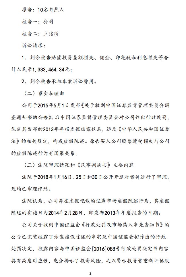 与此同时,金亚科技投资者索赔案仍在有条不紊地进行着。“近日,备受关注的投资者诉金亚科技、周旭辉证券虚假陈述纠纷案再起波澜又有了新的进展,成都中院正式通知追加立信会计师事务所(特殊普通合伙)(简称立信会所)为被告。”浙江裕丰律师事务所厉健律师告诉e公司记者,“根据原告书面申请,法院依法追加立信会所为被告,这对股民索赔是重大利好,这批案件定将于10月18日开庭,目前我们正在继续征集股民索赔。”
