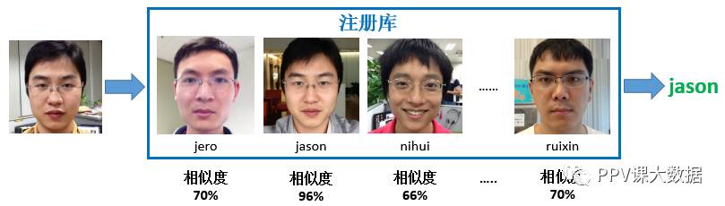 它的输入一个人脸特征,通过和注册在库中N个身份对应的特征进行逐个比对,找出“一个”与输入特征相似度最高的特征。将这个最高相似度值和预设的阈值相比较,如果大于阈值,则返回该特征对应的身份,否则返回“不在库中”。