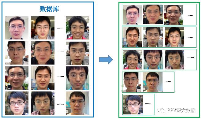 人脸聚类也通过将集合内所有的人脸两两之间做人脸比对,再根据这些相似度值进行分析,将属于同一个身份的人划分到一个组里。