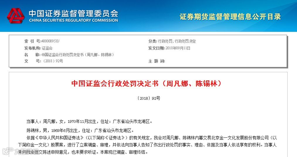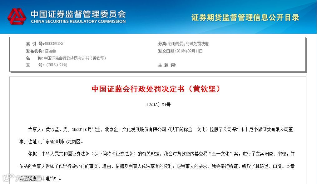 近日证监会公布对金一文化并购捷夫珠宝内幕交易当事人做出行政处罚,涉及黄钦坚、周凡娜、陈锡林等当事人,依法处理非法持有的股票,没收违法所得8.47万元,并处以93.88万元的罚款。