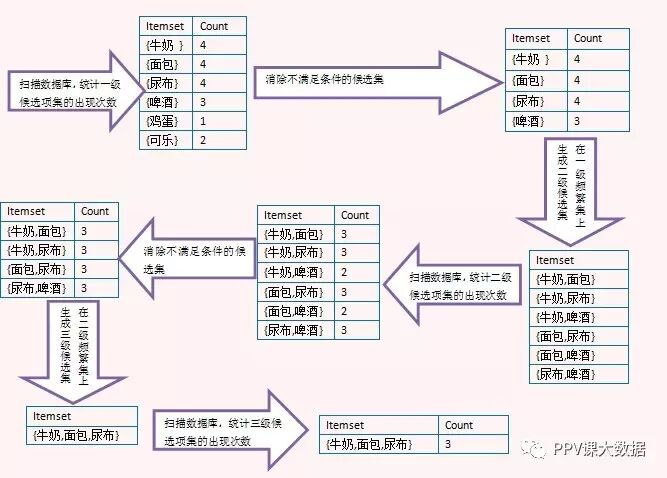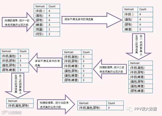 上面的图演示了Apriori算法的过程,注意看由二级频繁项集生成三级候选项集时,没有{牛奶,面包,啤酒},那是因为{面包,啤酒}不是二级频繁项集,这里利用了Apriori定理。最后生成三级频繁项集后,没有更高一级的候选项集,因此整个算法结束,{牛奶,面包,尿布}是最大频繁子集。