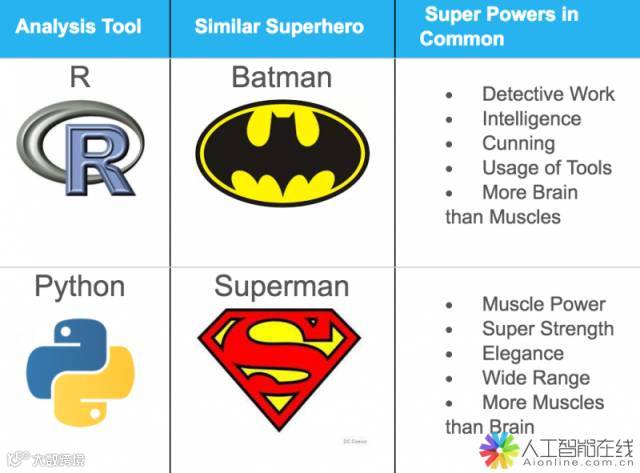Python 就像是超人,而 R 和蝙蝠侠之间有几点相似之处。让我们创建一个表来列出这些相似之处。