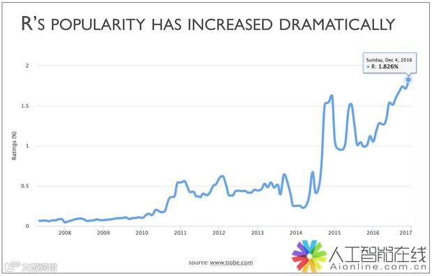 请记住,TIOBE 索引的结构是「编程语言受欢迎程度的指示」。索引每个月更新一次,评分是基于世界范围内的精尖工程师、课程和第三方供应商的使用量。像谷歌、Bing、雅虎、维基百科、亚马逊、油管和百度等热门搜索引擎则用来计算排名。到 2016 年 12 月,R 语言的总排名是 17(在所有编程语言中)。它的最高排名是 2015 年 5 月的第 12 名。