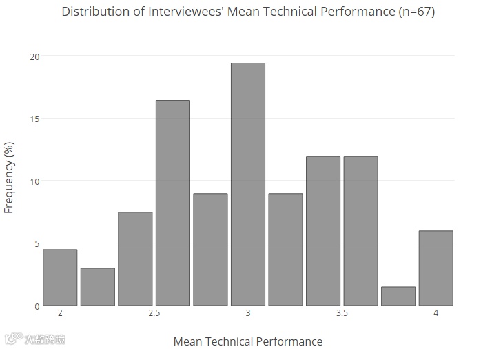 根据以下图表,可以看到所有面试者的平均技术评分的分布情况。