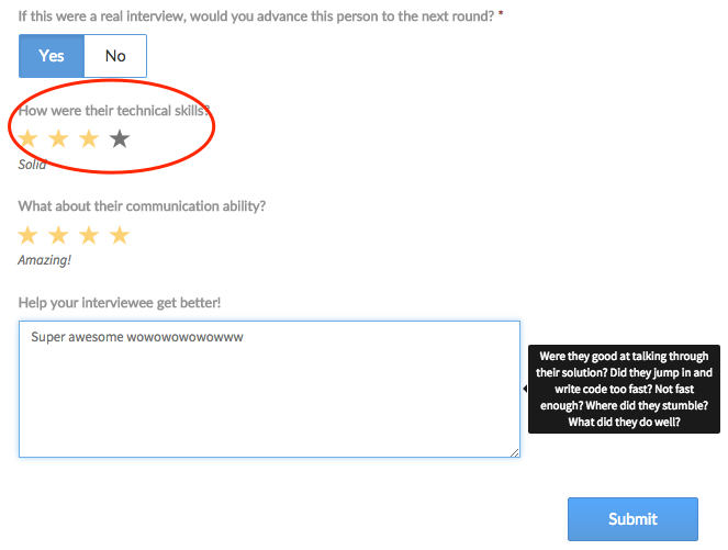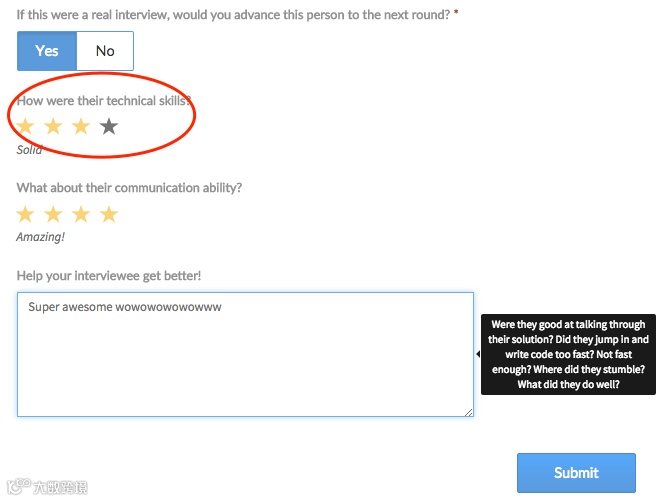 在每次面试后,面试官会对面试者进行评价打分,其中包括技术能力。技术能力得分为 1 到 4 分,其中 1 为“不怎么样”, 4 为“出色!” 一般达到 3 分就是很不错的成绩了。