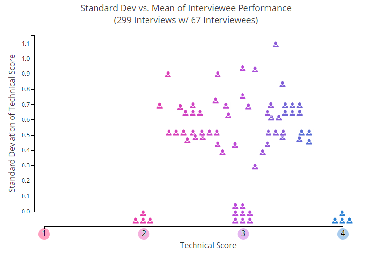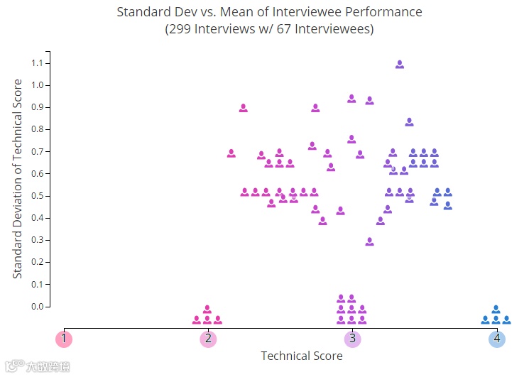 下图可以看到,每个人形的图标代表在平台上进行过 2 次或多次面试的个人平均技术得分。
