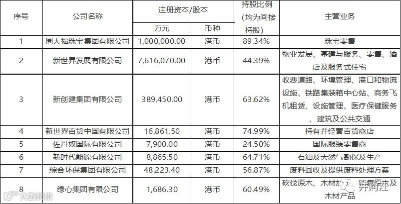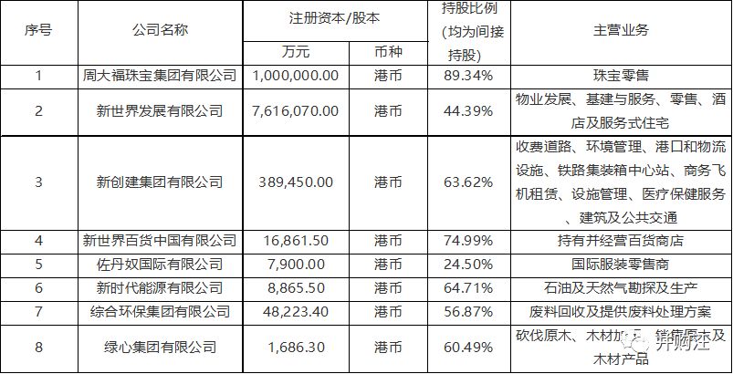 目前除了周大福之外,郑家纯控股的香港上市公司还包括绿新集团(00094.HK,16.88亿港元)、新世界发展(00017.HK, 1125亿港元)、新世界百货中国(00825.HK,30.52亿港元)、佐丹奴国际(00709.HK,74.21亿港元)、新时代能源(00166.HK,12.85亿港元)、综合环保集团(00923.HK,5.16亿港元)。