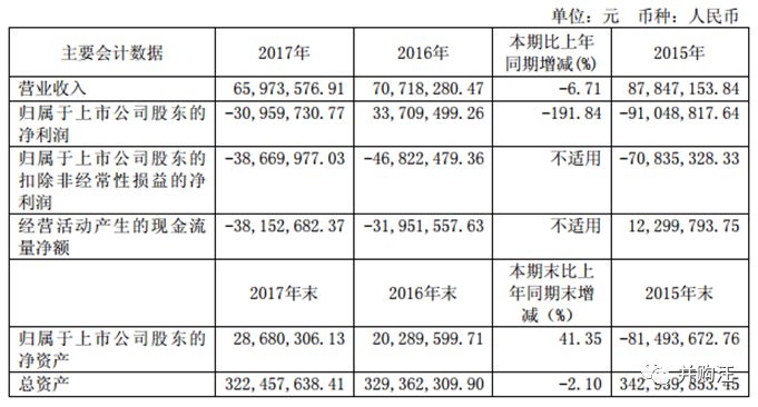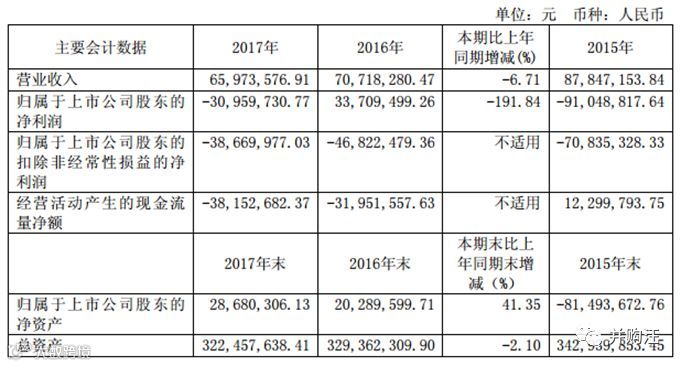 即便在2016年ST景谷通过拍卖林地等方式实现了盈利,撤销了退市风险警示,但如下表所示,目前ST景谷业绩仍然堪忧。2017年度,ST景谷实现营业收入0.66亿元,实现归母净利润-0.3亿元,资产总计3.225亿元,期末资产负债率达92.00%,期末累计未分配利润为-3.9亿元。