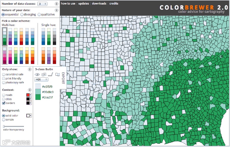 Color Brewer 由Penn State开发,是一款用于选择地图颜色的工具,用户可以用它来保证特殊区域的独立性。