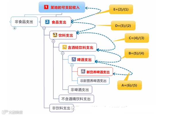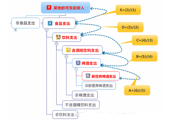 故:新营养啤酒在某地的市场规模=该地可支配收入*E*D*C*B*A
