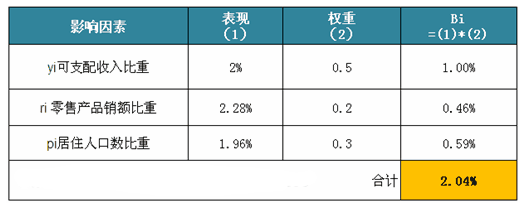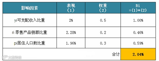 (其中Bi购买力指数,即地区i的购买力占全国的比重;yi为地区i的个人可支配收入占全国的比重;ri为地区i的零售产品销额占全国比重;pi为地区i的居住人口数占全国比重)弗吉尼亚州在yi、ri和pi上与美国总体的比较,可得Bi=2.04%(见下表)