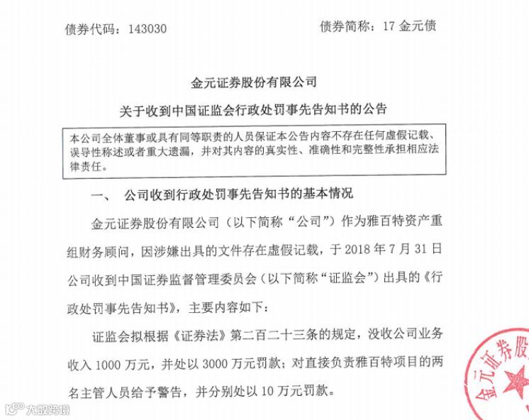 8月16日,金元证券发布公告称,作为雅百特科技股份有限公司资产重组财务顾问,因涉嫌出具文件存在虚假记载,于7月31日收到证监会出具的《行政处罚事先告知书》: