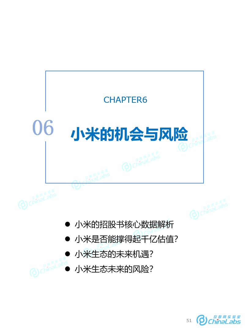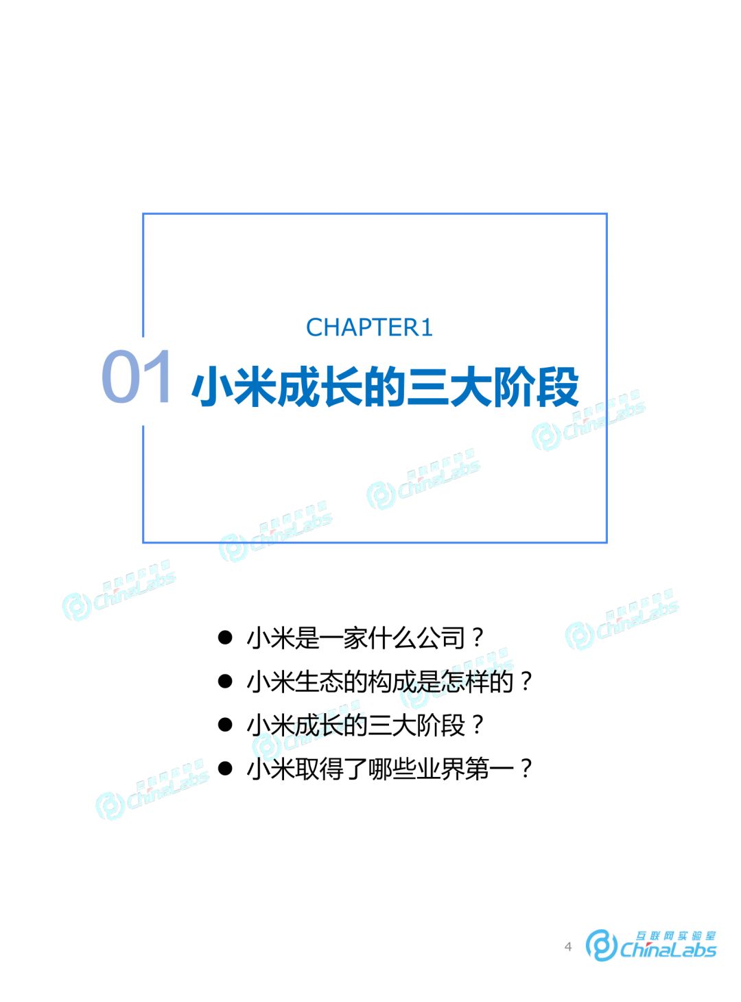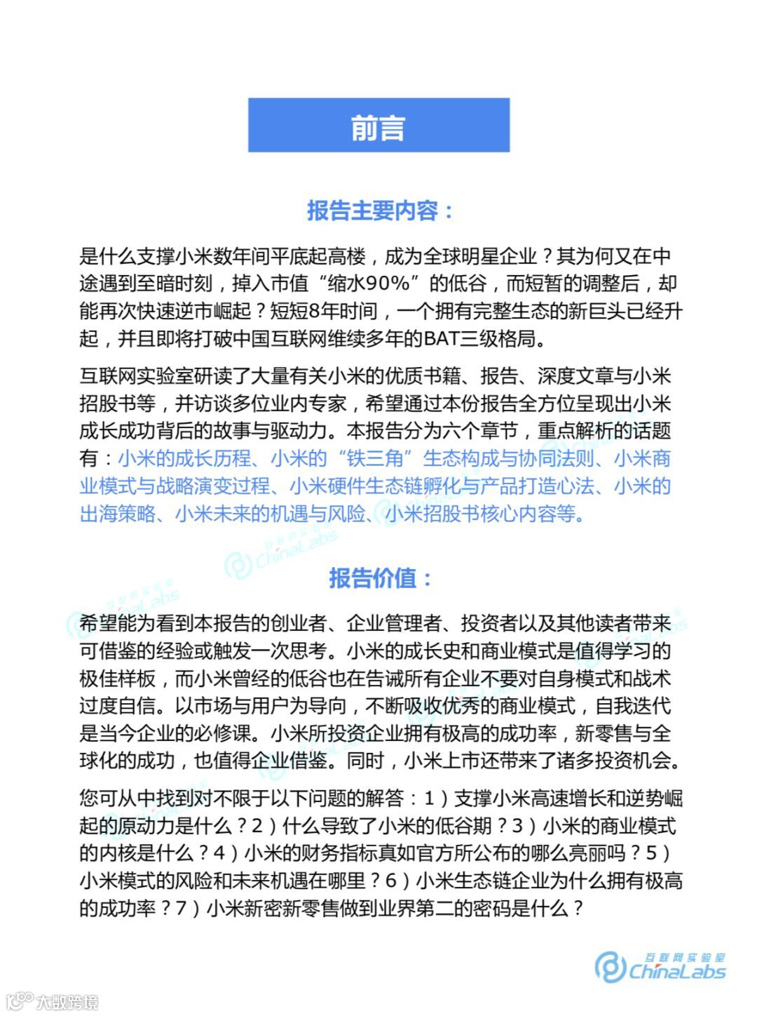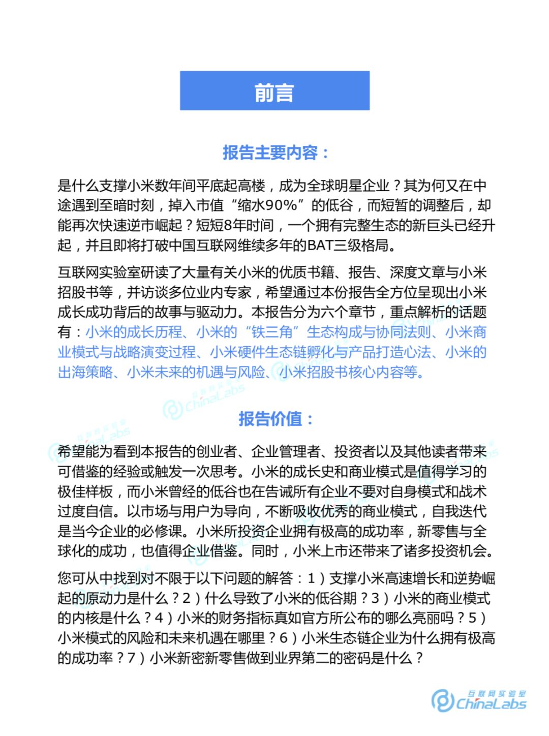 本份报告全方位呈现小米成长成功背后的故事与方法论,并预测小米生态未来的6大机会与6大风险,希望能为看到本报告的读者带来可借鉴的经验或触发一次思考。