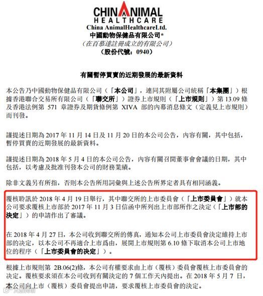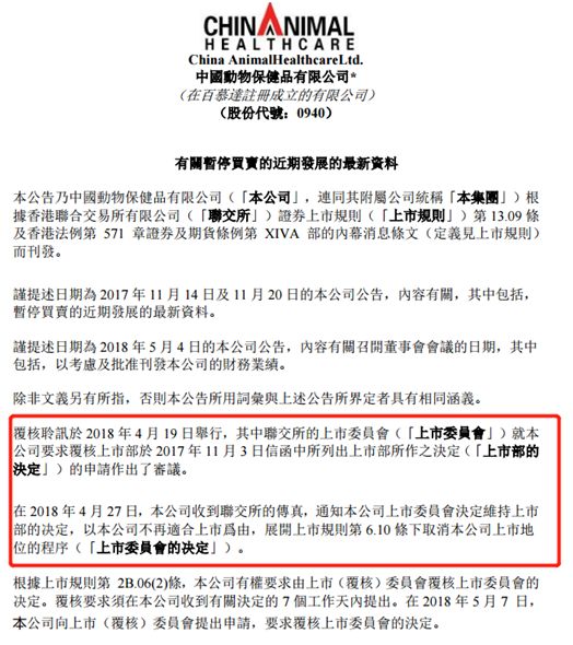 5月,中国动保发布公告,称4月27日收到联交所传真,决定以公司不再适合上市为由,展开取消公司上市地位的程序。