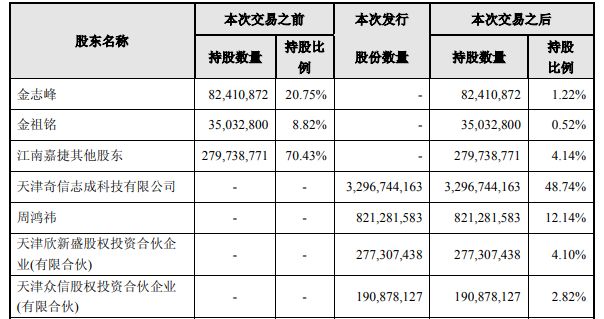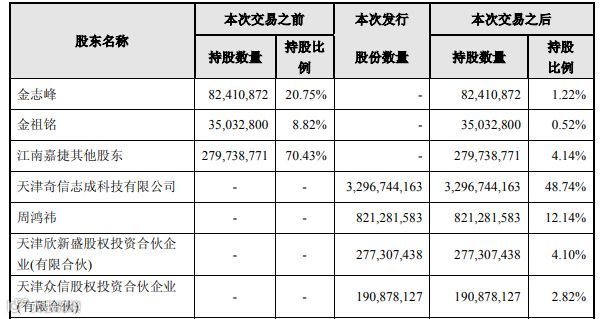 公告披露,本次三六零发行股票数量6,366,872,724股,发行价格7.89元/股。交易后,天津奇信志成科技有限公司持有公司股份比例为48.74%,周鸿祎个人持股比例12.14%,齐向东持股比例1.79%。