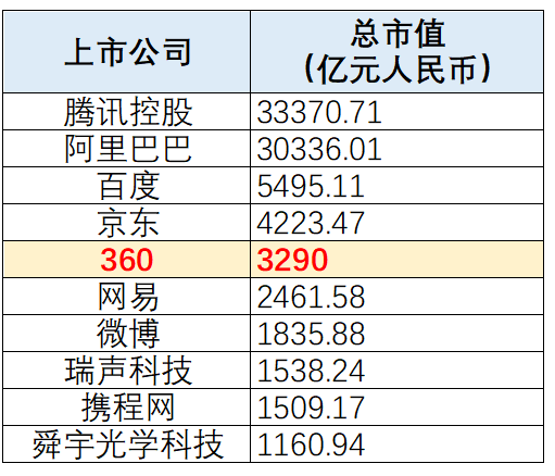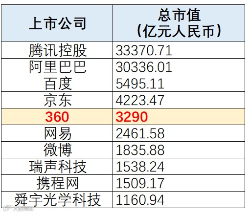 以今天中午的市值来比较,360市值仅次于腾讯、阿里、百度和京东。