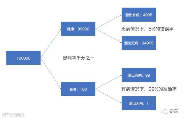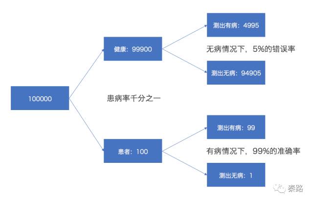 最终健康人群中误测出有病的是4995个,而真正患者中测出来是99个。所以当遇到一个患者被测出来有病,实际上真正得病的概率是99/(4995+99)=1.9%。