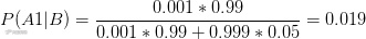 P(A1|B)是在B发生的情况下A发生的可能性。应用在上文的例子中,就是试纸查出其为患者的情况下,他是真的患者的概率。将数字都代入公式计算。