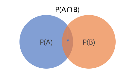 P(A∪B) = P(A)+P(B) - P(A∩B)。P(A∪B) 是两个圆形面积,P(A)是蓝色圆面积,P(B)是橙色圆面积,当两者相加时,会多出一块重叠区域,于是减去P(A∩B)进行修正,得出正确的结果。