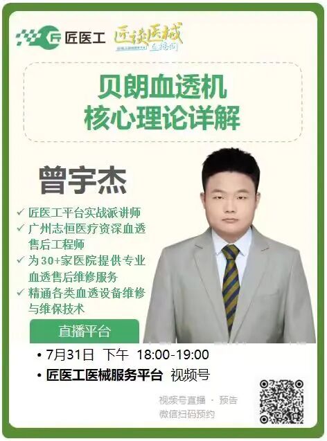 这个周四的 18:00,让我们相约匠医工医械服务平台视频号,一起探索贝朗血透机的奥秘,提升专业技能,在血透领域绽放更耀眼的光芒!赶紧预约蹲守,千万别错过这场干货盛宴!