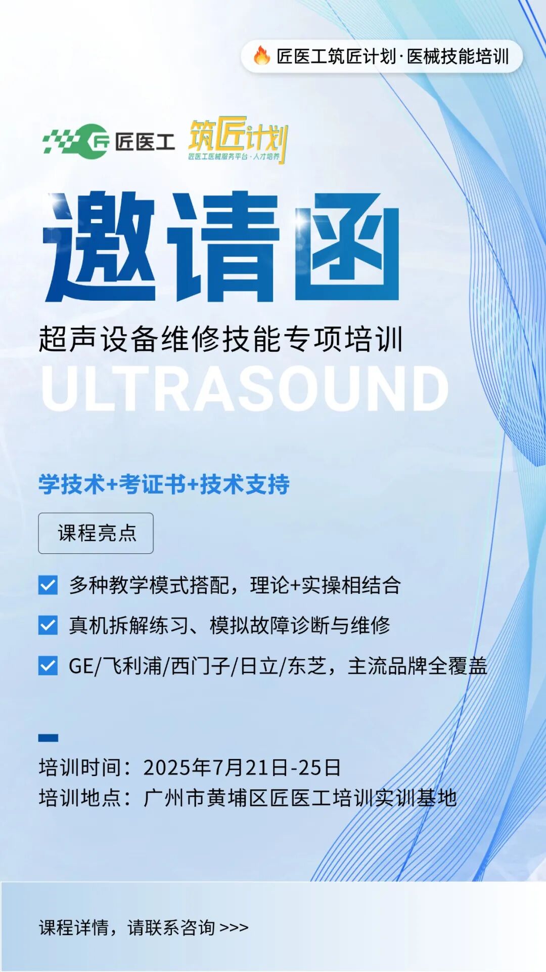 在国家大力推动优质医疗资源下沉的浪潮中,超声设备装机量激增与专业维修人才短缺的矛盾日益尖锐,匠医工医械服务平台立足行业痛点,重磅推出“第44期筑匠计划·超声设备维修技能专项培训”(7月21日-7月25日),助你抢占职业发展制高点!
