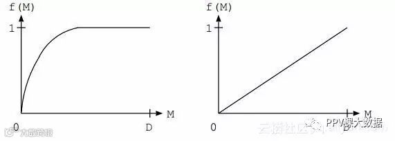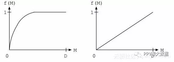 看看f(M)(贡献率)如何随着M而增加,并且在M = D处获得最大值1,给定两图:
