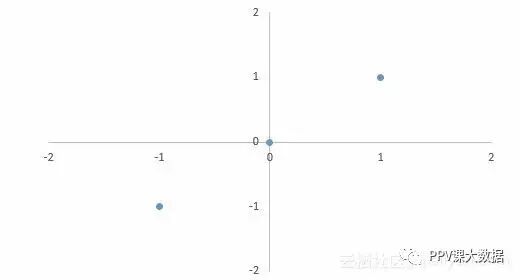 考虑2维空间中的3个数据点:(-1,-1)、(0,0)、(1,1)。