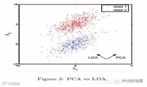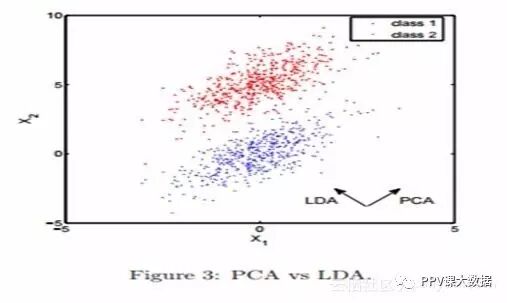 以下快照显示了两个特征(X1和X2)与类别信息(红色、蓝色)的散点图,还可以看到PCA和LDA的方向。