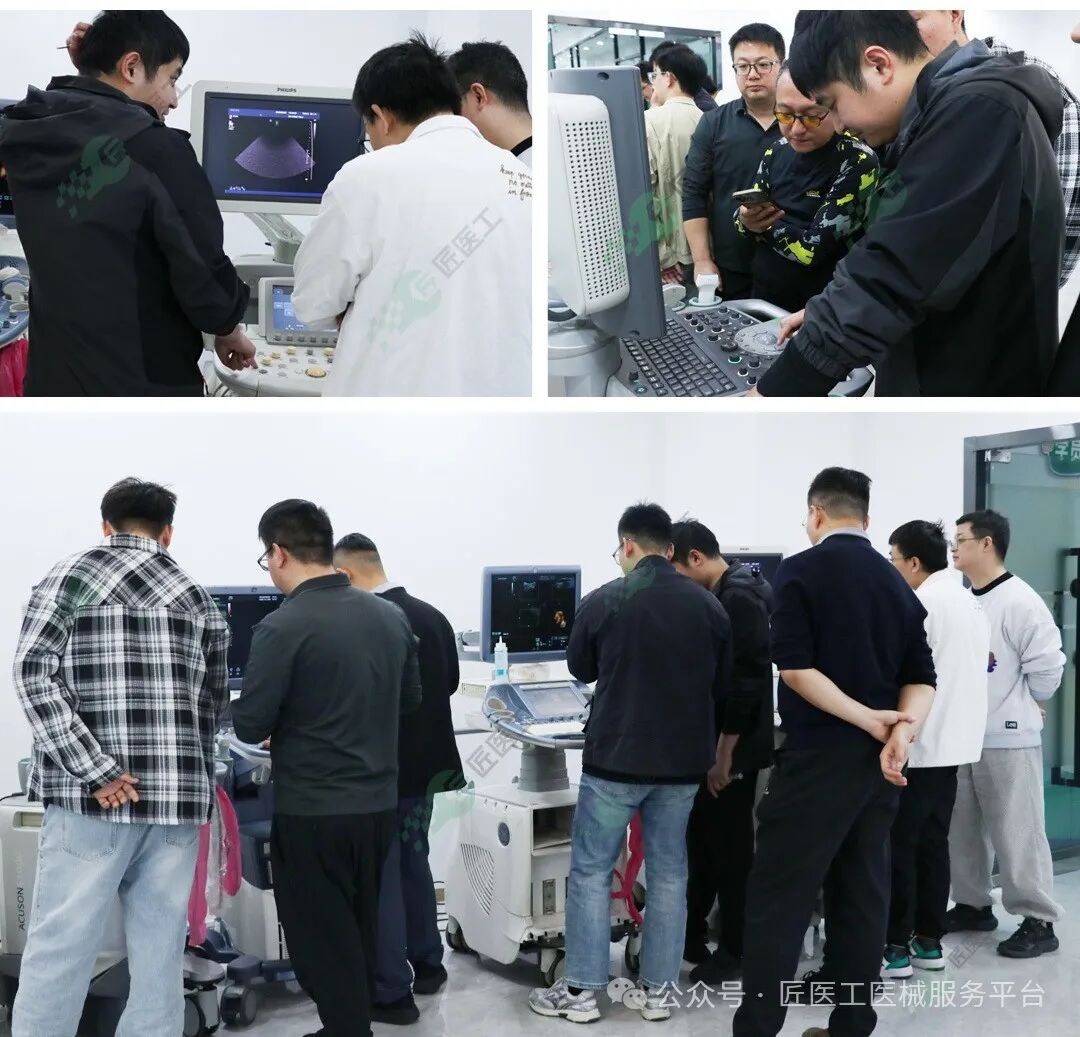 实践操作是本次培训的重点。匠医工医械服务平台精心筹备了十几台不同品牌、不同机型的超声设备,涵盖市场上常见的主流型号。