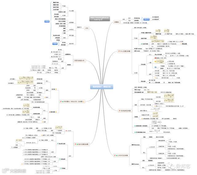 本文用一系列「思维导图」由浅入深的总结了「统计学」领域的基础知识,是对之前系列文章做的一次完整的梳理,也是我至今为止所有与统计有关的学习笔记。众所周知,「统计学」是深入理解「机器学习|数据挖掘」的重要基础学科。正所谓磨刀不误砍柴工,对于数理基础薄弱的人,强化一下理论的学习是大有裨益的。普通人难以做到“一次学习”,经典知识总是在一次次回顾后才能有更深入的理解。这也是我选择「思维导图」作为学习工具的原因,发散性思考的模式能帮助迅速回忆起相关的知识。近一个月我对之前陆陆续续学习的统计知识进行了系统性的复习、知识点补充以及思维导图笔记的完善,在这里把完整的笔记和大家分享。本文图片很多,请在wifi下阅读哦。