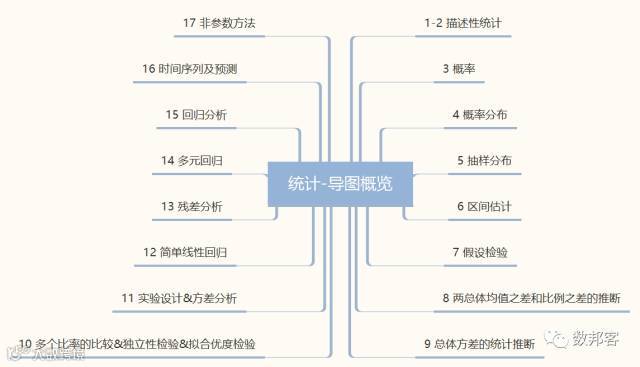 关注“PPV课大数据”公众号回复关键字“导图”,获取“「统计学」领域高清17张思维导图”下载链接。