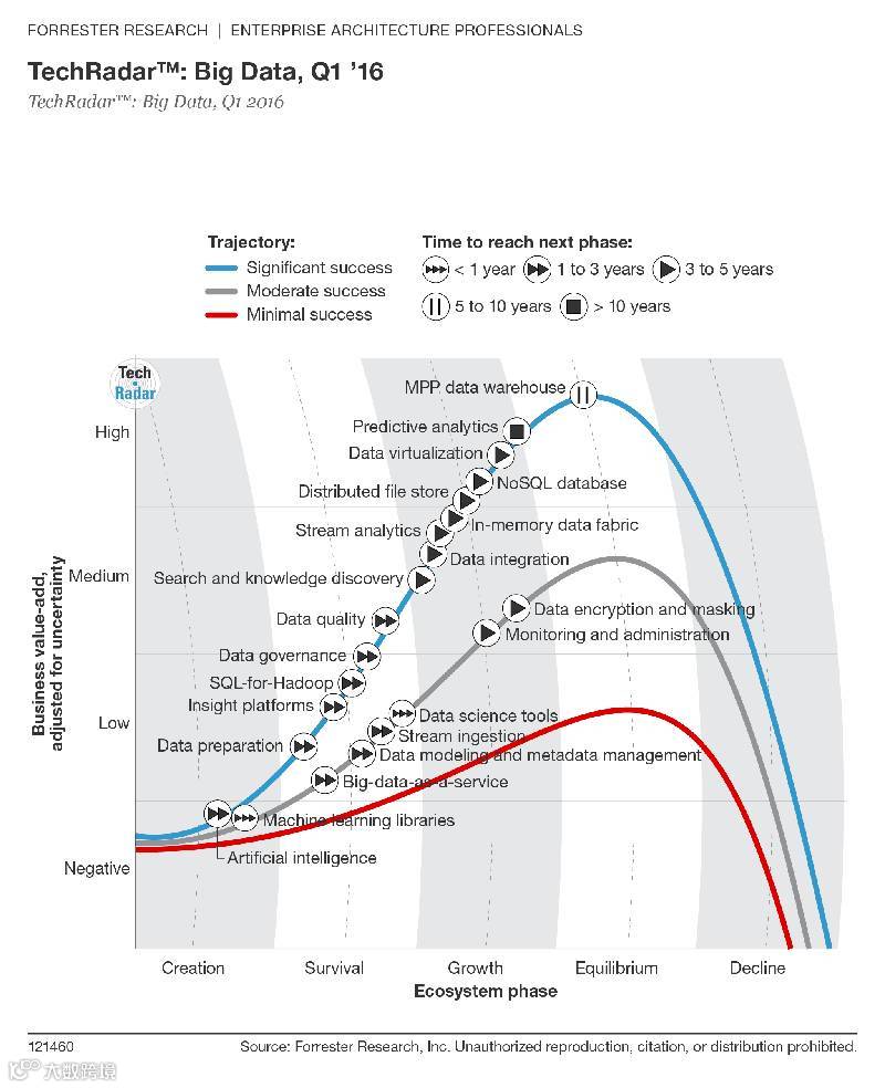 Forrester 提到:“如果该技术处于发展的早期阶段,其失败的可能性大于发展较为完善的技术。”从商业增值角度来看,上述前两项技术的商业增值较高,之后紧接着的两项技术为中等,其余为较低,毫无疑问这是因为其处于新兴状态且发展还不成熟。