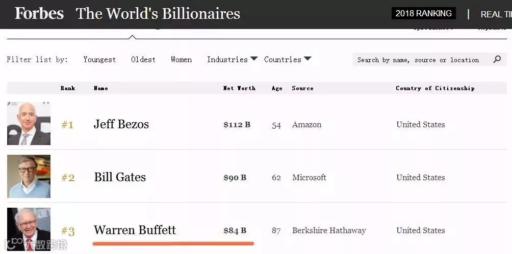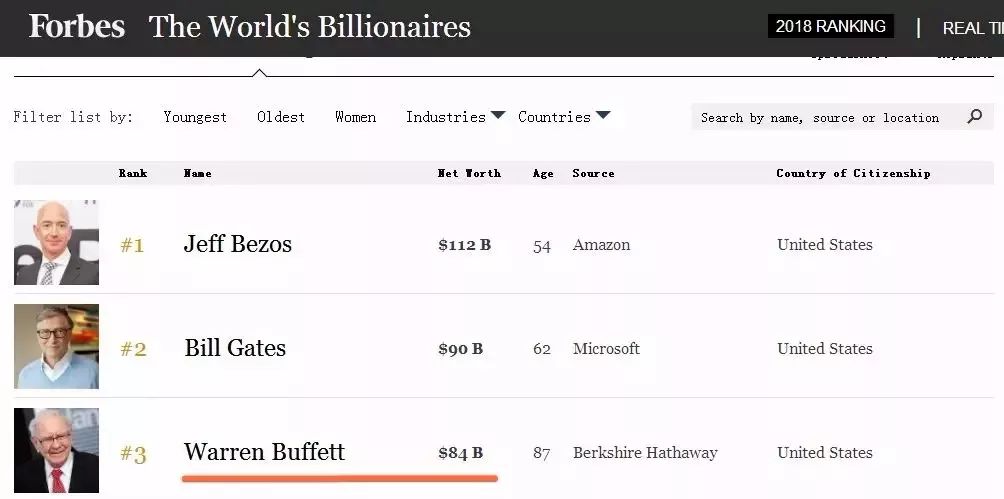 根据福布斯实时富豪榜的数据,巴菲特当前身家达840亿美元,排名全球第三。
