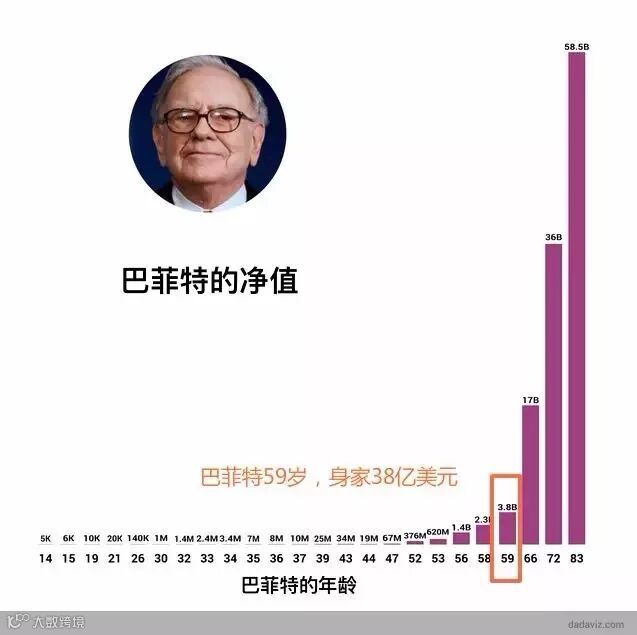 也就是说,股神有800多亿美元,是在59岁之后挣的。从38亿美元到840亿美元,增长了21倍。