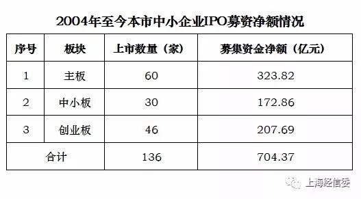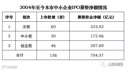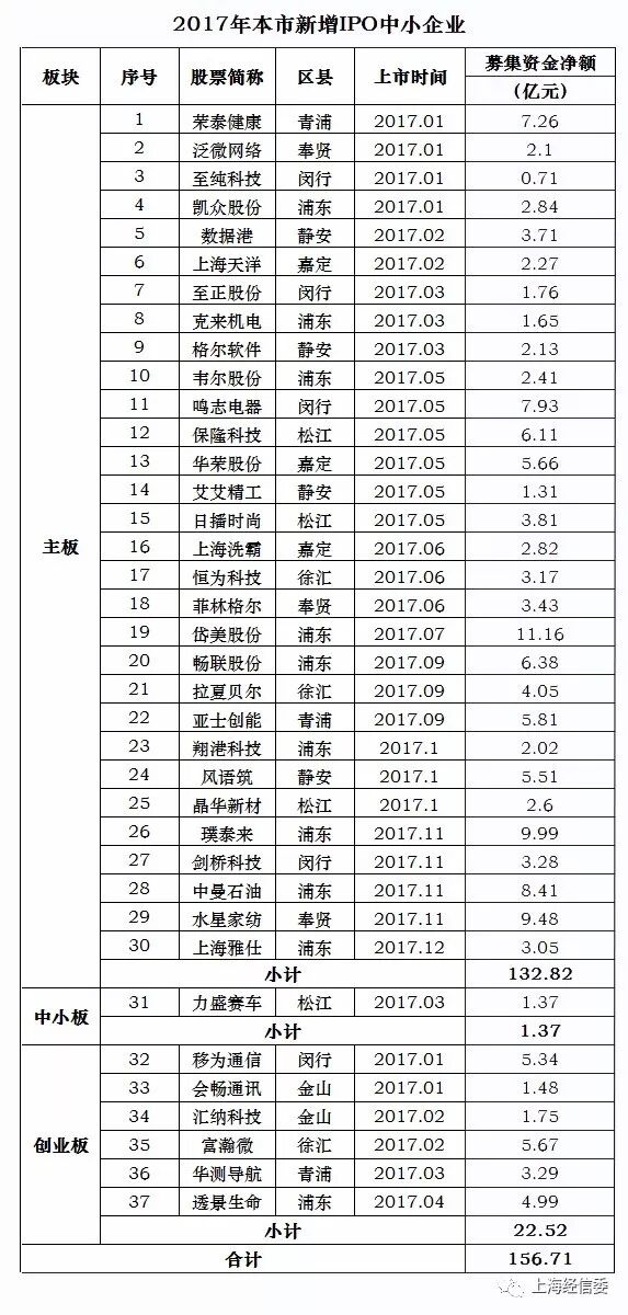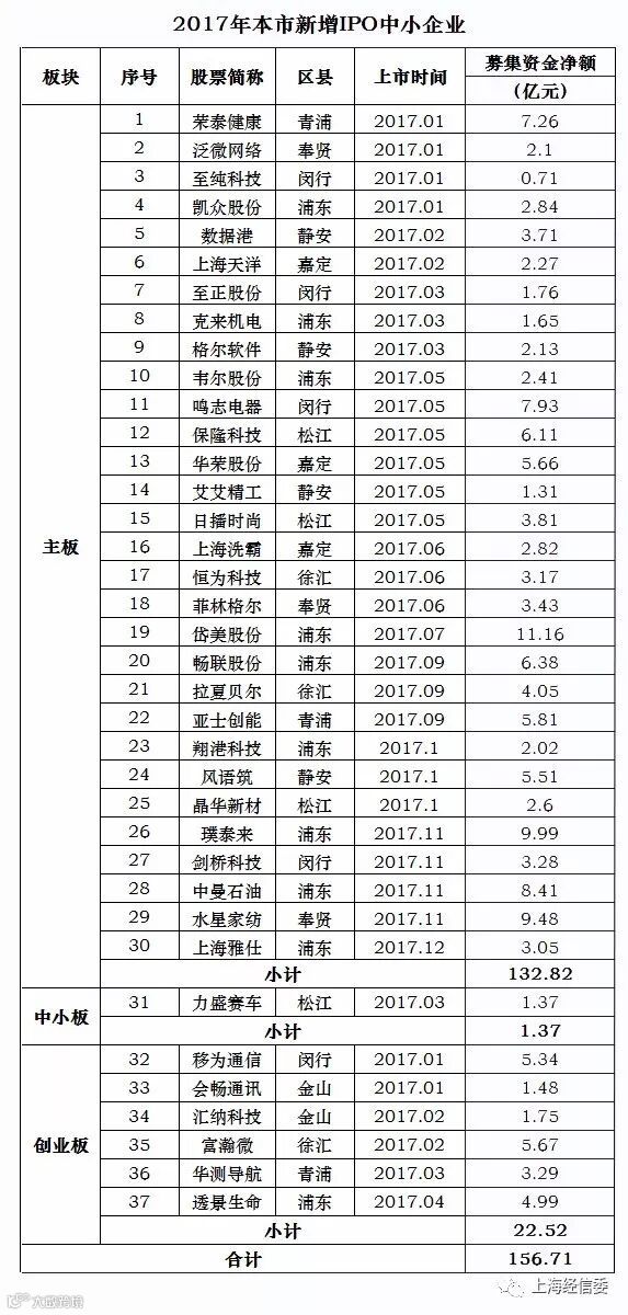 其中,2017年本市新增IPO中小企业37家,累计募集资金净额156.71亿元。其中主板30家(132.82亿元)、中小板1家(1.37亿元)、创业板6家(22.52亿元)。