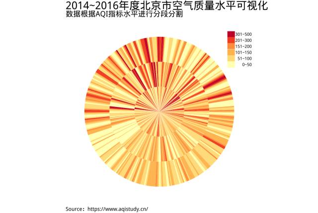 labs(title="2014~2016年度北京市空气质量水平可视化",subtitle="数据根据AQI指标水平进行分段分割",caption="Source:https://www.aqistudy.cn/",fill="")+