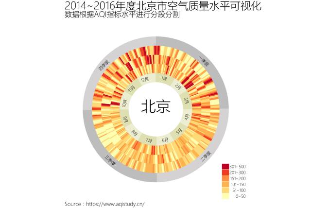 接下来让我们疯狂一把,将北京三年的空气质量指标AQI用一幅图形尽数呈现。